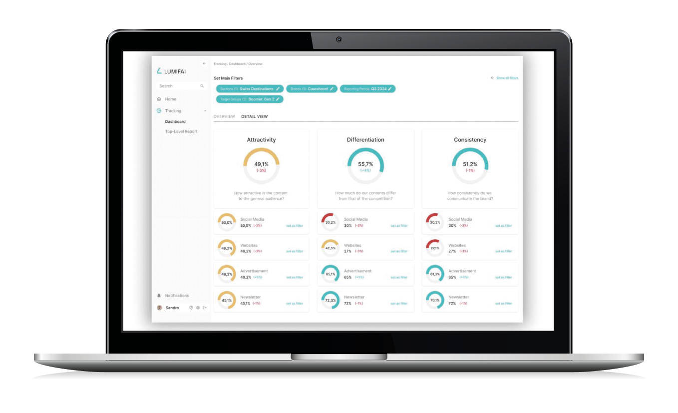 Statt CPC, Engagement-Rate und Co. haben Sie im einfachen Ampel-Farbsystem drei klare Kennziffern: Attraktivität, Differenzierung und Konsistenz