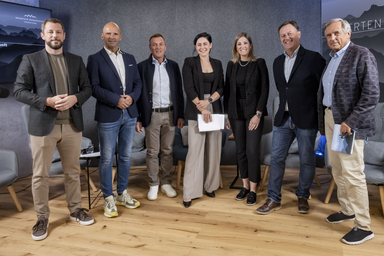 Lukas Heymich (Obmann TVB Serfaus-Fiss-Ladis), Prof. Hubert Siller (Leiter MCI Tourismus), Benny Pregenzer (Consultant, früher CEO Bergbahnen Fiss), Kathi Hager (Moderatorin), Selina Gull (Marketingleitung Zermatt Tourismus), Bruno Felicetti (General Manager Funivie Madonna di Campiglio S.p.A.) und Mike Partel (Geschäftsführer Mountain Management Consulting und Initiator des Experten-Talks).